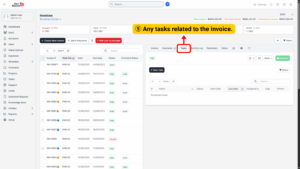 b) Tasks – Lists any tasks associated with the invoice, such as sending reminders, following up with customers, or checking with the finance team.