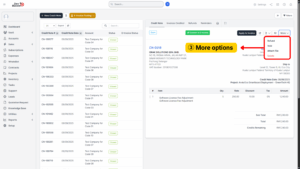 The system provides a More dropdown menu with extra functions for managing credit notes beyond just saving them. These options include: